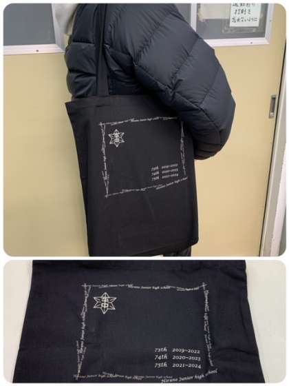 平中オリジナルデザインバッグ 公開日 2021/12/15 更新日 2021/12/15 出来事 コロナ禍の中で、PTA主催の行事も開催されなかったため、学校でも使える布製バッグを配布しました。移動教室の時に教科書や用具を入れて持ち運ぶのに便利です。PTAの委員の方々がデザインを考えてくださいました。全校生徒が同じ物を持っているので、どこかに名前を書いて、大切に使いましょう。