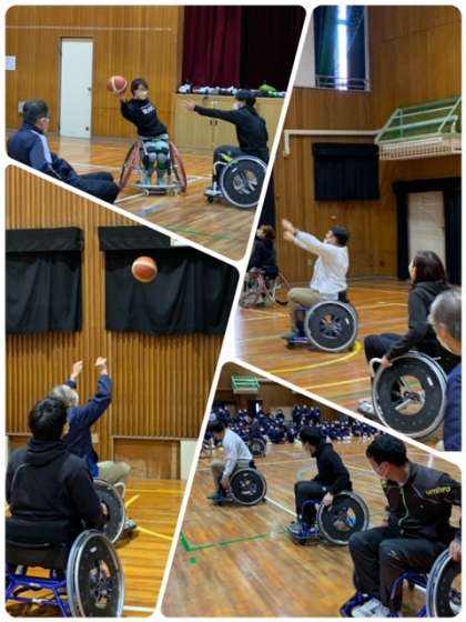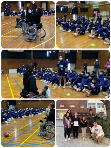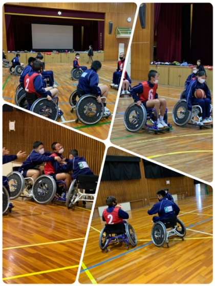 3年 オリパラ夢授業 2 公開日 2021/12/20 更新日 2021/12/20 出来事 クラス対抗の試合では、車椅子を上手に操作し、迫力のある試合でした。シュートが決まった時は大歓声で、観戦している生徒もとても楽しそうでした。最後は、網本さんVS先生9人の試合をしました。網本さんのプレーを観てさらに盛り上がり、先生達のプレーも楽しんでいました。 試合の後の質疑応答を通して、心に残る言葉をたくさんいただきました。進路に向けて頑張っている3年生に、その言葉はしっかり届いたことでしょう。
