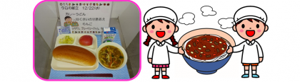 給食では、昨日の献立で「かぼちゃ」、そして今日の献立では、「うどん」を使用しています。