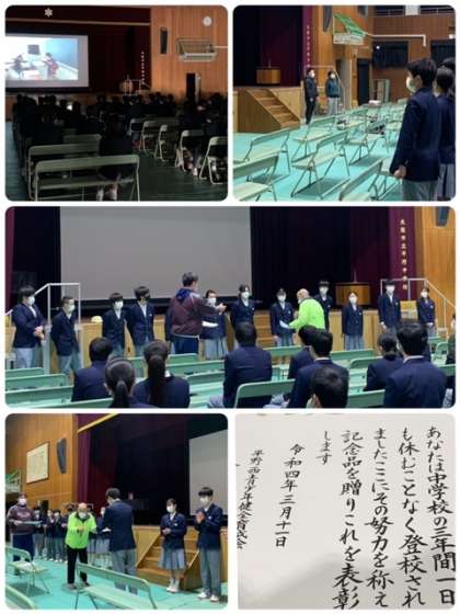 3年生 学年集会 公開日 2022/03/08 更新日 2022/03/08 出来事 後輩からのメッセージや思い出動画を観た後、3年間皆勤できた12名について、地域の青少年健全育成会から賞状伝達がありました。3年間登校すべき日に、休むことなく登校したことに自信を持ってください。