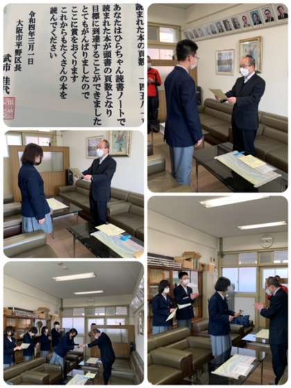 平野区の読書を推進する取組、ひらちゃんノートの賞状伝達を行いました。3年生9名、1年生3名が表彰されました。これからもたくさん本を読んでくださいね。