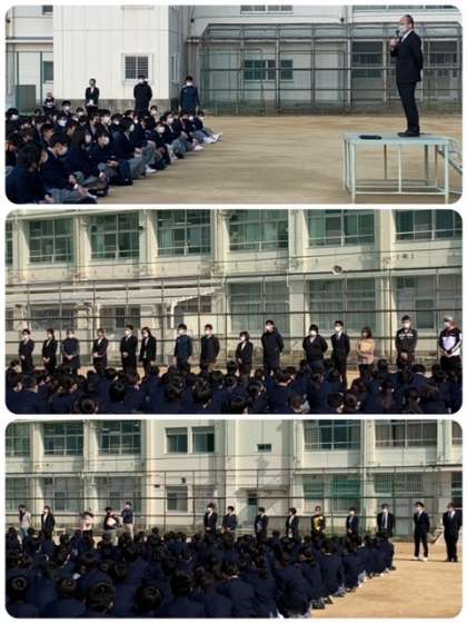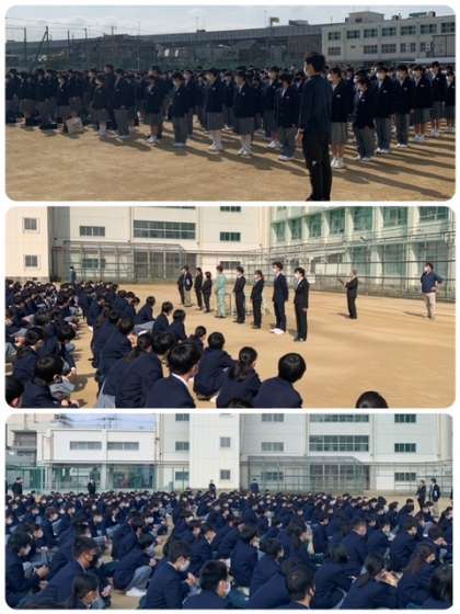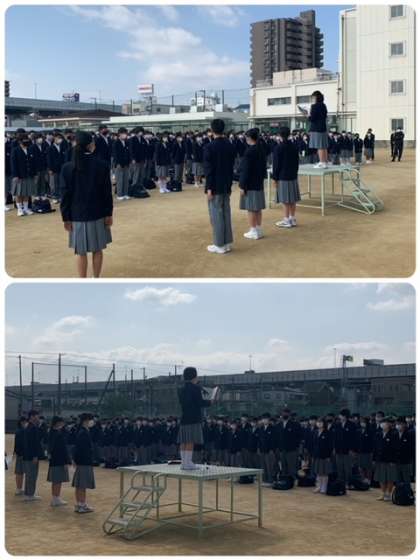 1学期 始業式 公開日 2022/04/08 更新日 2022/04/08 出来事 新しく着任された教職員、学年の先生方の紹介の後、始業式を行いました。対面式では、新入生代表生徒が元気に挨拶をしてくれました。