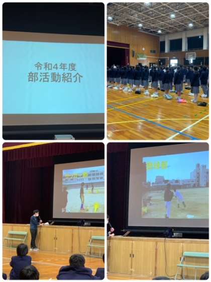 部活動紹介 公開日 2022/04/13 更新日 2022/04/13 出来事 明日から始まる部活動体験の前に、今日の6時間目に部活動紹介がありました。通常は2、3年生が主体となって活動内容を紹介しますが、コロナ禍のため、学年主任の先生からそれぞれの部活動の紹介がありました。明日からの部活動体験が楽しみですね。下校時刻が少し遅くなるので、必ず保護者の方に伝えてください。