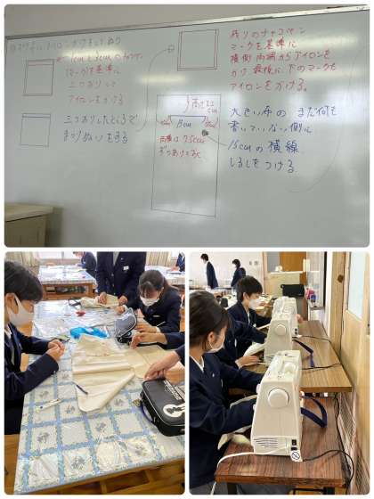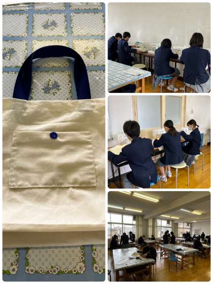 家庭科の授業では、ミシンを使ってトートバッグを作成しています。