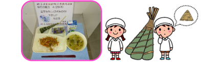 今日は少し早いですが、端午の節句(こどもの日)の行事献立として、「ちまき」を献立にとり入れています。