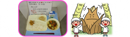 今日の給食では、かつお節とごまを加えて炒め、みりん、しょうゆで味つけした「ごまかか炒め」にしています。