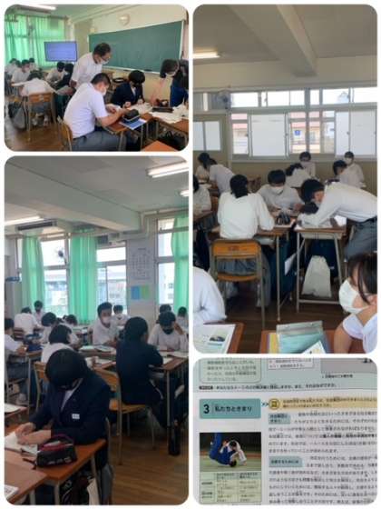 3年生研究授業 公開日 2022/06/11 更新日 2022/06/11 出来事 生徒の学力向上と教員の授業力向上を目指し、研究授業を行いました。教員が3年生の数学、美術、理科、社会の授業を参観しました。