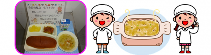 今日の給食では、お米と鶏肉、たまねぎ、グリンピースを具材として、カレーソースをかけ、さらにパン粉と粉末チーズをかけてオーブンで焼き上げています。