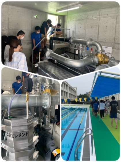 プールの工事が完了しました。濾過機や施設の説明を聞き、プール開きの準備をしました。