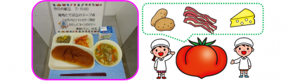 今日の給食では、今が季節の生のトマトにベーコン、じゃがいも、チーズなどをとり合わせてオーブンで焼き、栄養のバランスとともに、それぞれの食材のおいしさを引き出した献立にしています。ご家庭でも簡単にできますので、日々の食事の一品としても利用してみてください。