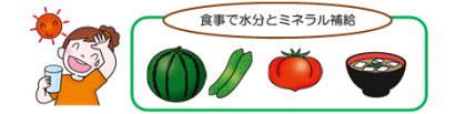 そのためには、水分と合わせて塩分を補給するタブレットなどの利用や、経口補水液、スポーツドリンクなども有効ですが、食事のときに、スイカ、きゅうり、トマトなどの水分の多い食品や、みそ汁、スープなどの汁物を利用することも効果的です。とくに汁物は、具として野菜や海藻などを上手く使うことでミネラル成分もしっかりとることができますので、たいへん効果的です。