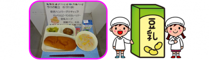 今日の給食では、スープに豆乳を加えています。スープに加えることで、優しい感じの味わいになります。