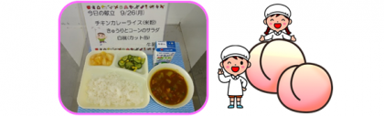 今日の給食では、山形県産の白桃をおよそ2cmの角切りにして缶詰にしたものを使用しています。