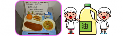 大阪市の給食では揚げ物の油には菜種白絞油、炒め物やドレッシングの油には綿実油を使用し、用途に応じて使い分けしています。今日は、揚げぎょうざの揚げ油として使用しています。