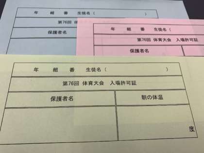 写真の入場許可証を9月26日に配布していますので、ご記名、検温の上持参して下さい。