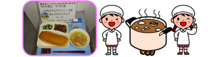今日の給食では、レトルトパックのデミグラスソースとりんごピューレ、ウスターソース、ケチャップで味を調えたソースで、炒めた牛肉、玉ねぎなどを煮込んでいます。