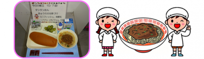今日の給食では、豚骨スープにチンゲン菜、もやし、にんじんなどの野菜と中華麵を加えて味付けしたスープ麺に、テンメンジャンやみそなどで味付けした挽肉をのせて食べてもらうようにしています。