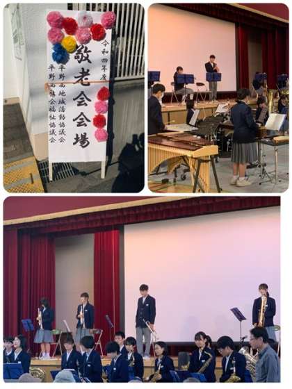 地域の敬老会で吹奏楽部が演奏させていただきました。「男はつらいよ」のテーマソング、坂本九さんのメドレーを披露しました。地域の皆様、本日はおめでとうございました。