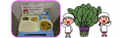 旬は10〜3月で、「冬菜」「雪菜」などとも呼ばれ、カロテンなどのビタミン類のほか、カルシウム、鉄などのミネラル成分も多く含み、栄養価の高さは野菜の中ではトップクラスです。今日の給食では豚肉とともに炒めものとして使用しています。