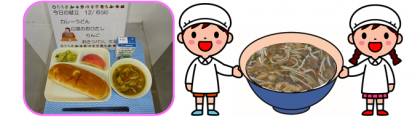 今日の給食では、昆布と削り節でとっただしに、牛肉、うすあげ、野菜などを加えて、カレールウの素、しょうゆなどで味付けしたカレー汁に、ゆでた乾めんを加えています。
