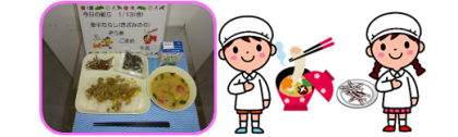 お正月には、昔から新年のお祝いと健康と幸せの願いを込めた料理を食べる風習がありました。各ご家庭でも、色々な料理を楽しまれたことと思います。少し遅くなりましたが、給食でもささやかながら、本日、正月の行事献立として実施しました。