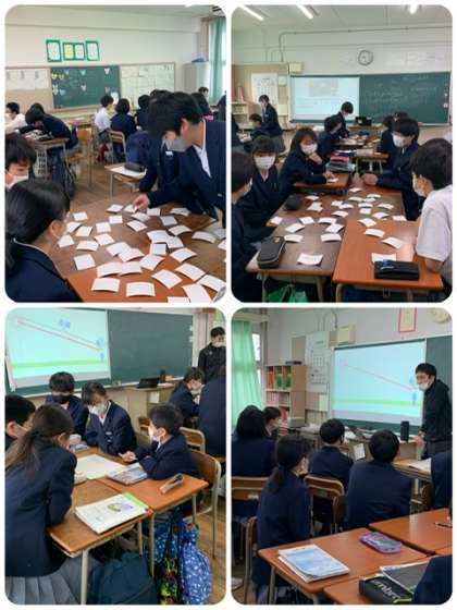 1年生英語、理科 公開日 2023/01/24 更新日 2023/01/24 出来事 英語の授業では、過去のことについて伝えたりたずねたりする表現をカードを使って学習しました。理科の授業では、音の速さについて考えを深めました。