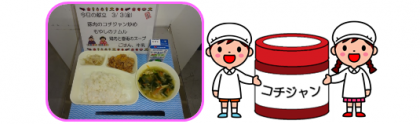 今日の給食では、豚肉と大根をにんにく、砂糖、しょうゆ、コチジャンで味付けした炒めものにしています。