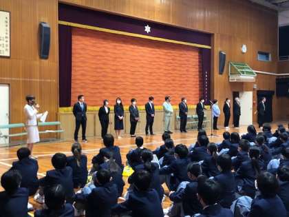 新年度スタート 公開日 2023/04/10 更新日 2023/04/10 出来事 4月10日(月) 3学年が揃っての令和5年度が始まりました。 2・3年生は運動場でクラス分け発表が行われ、その後体育館にて着任式があり、教頭先生から新しく来られた教職員の方々の紹介がありました。