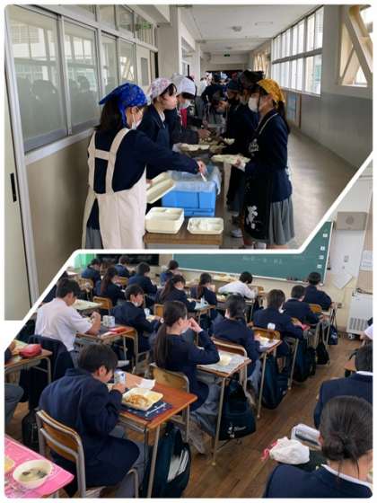 給食の準備と給食の様子です。 新型コロナの感染対策は緩和されましたが、依然として前向きでの喫食は変わりありません。