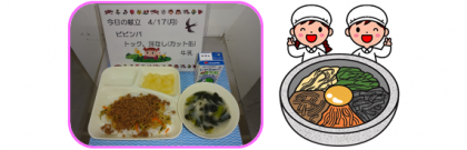 今日は給食では、牛・豚の挽肉をごま油で炒め、砂糖、しょうゆ、コチジャン、料理酒で味つけしたものと、きゅうり、にんじん、切り干し大根を砂糖、塩、しょうゆ、ごま油、いりごまで味つけしたナムルを具として使っています。