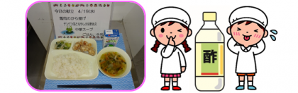 今日の給食では、米酢に砂糖としょうゆを合わせて甘酢をつくり、ゆでた野菜にあえています。
