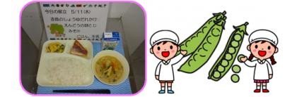 今日の給食では、グリンピースを鶏肉とともに和風の味付けで煮て、溶き卵でとじ、「えんどうの卵とじ」にしています。また、普段グリンピースは、冷凍のものを使用していますが、今日は旬のものとして、和歌山産の生のえんどうを使用し、給食室でさやから取り出すところから調理しています。