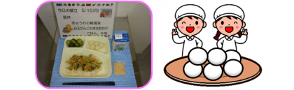 今日の給食では、冷凍加工された白玉だんごをスチームコンベクションオーブンで蒸し、砂糖、しょうゆ、水を合わせて煮て、でんぷんでとろみをつけたたれをからめたものに、きな粉を添えています。