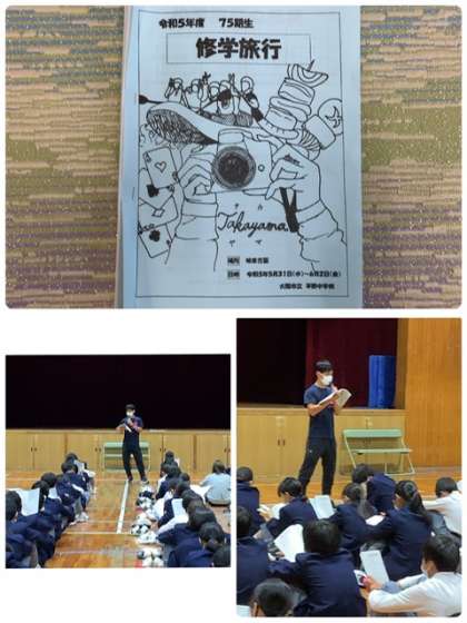 3年 特活 公開日 2023/05/19 更新日 2023/05/19 出来事 本日6時間目、3年生は体育館で、しおりを使った修学旅行の説明が実施されました。 しおりを、修学旅行の準備の為に本日持ち帰る生徒は、週明けにはまた、学年で使用することもあるので、忘れずに持参してください。