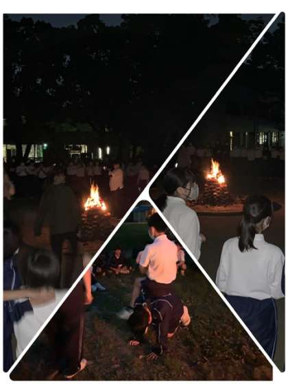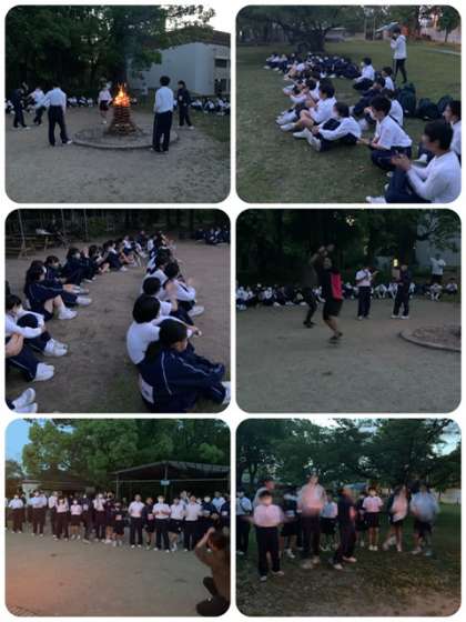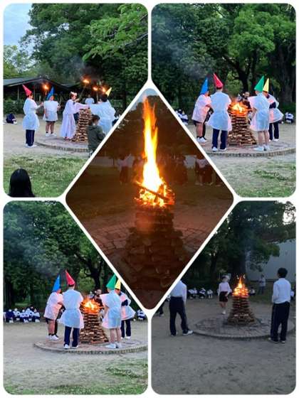 一泊移住11 公開日 2023/05/25 更新日 2023/05/25 出来事 今日最後の活動はキャンプファイヤーでした。実行委員が中心になって企画,準備をしてくれました。火の精(学級代表)4人が誓いを立てたあと、じゃんけん大会、猛獣狩りゲーム,ジェスチャーゲーム,記憶ゲームで盛り上がりました。