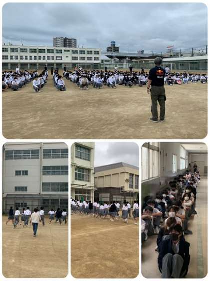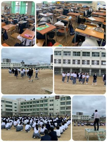 地震及び津波警報発令時の避難訓練を行いました。日本各地で地震が多発している現状をふまえ、避難に対する心構えや避難経路を確認し、運動場に避難しました。地震を想定した避難では、点呼終了,安全確認まで4分40秒かかりました。津波の二次避難は校舎の3階へ避難しました。いざという時に迅速に避難できるように,真剣に訓練に参加しました。