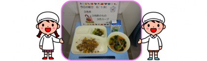 今日の給食献立は、昨年度の学校給食献立コンクール優秀賞作品です。出品者は、阿倍野区丸山小学校6年1組の児童たちです。