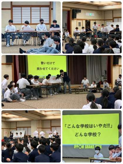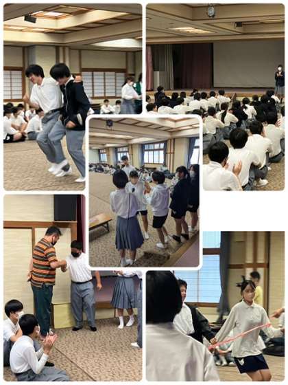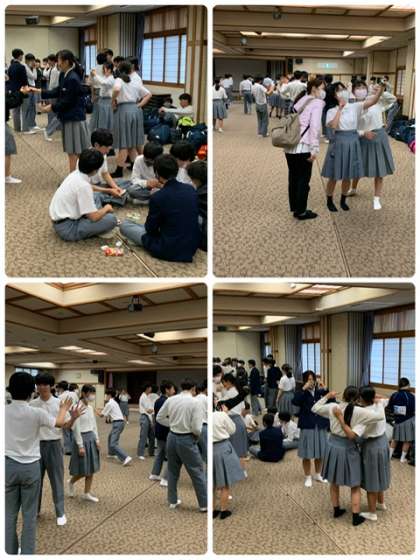 修学旅行3日目3 公開日 2023/06/02 更新日 2023/06/02 出来事 ラフティングが中止となり、白川郷に向けて出発までの1時間を実行委員で考え、昨日のゲームの続きと写真を撮る自由な時間としました。