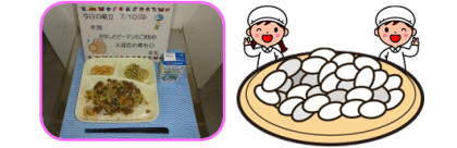 今日の給食では、砂糖、塩、しょうゆを使って甘い味付けの煮ものにしています。