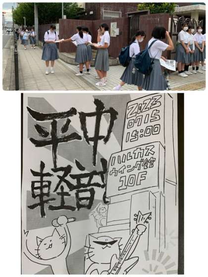 吹奏楽部の生徒が登校時に案内のビラを配布しています。