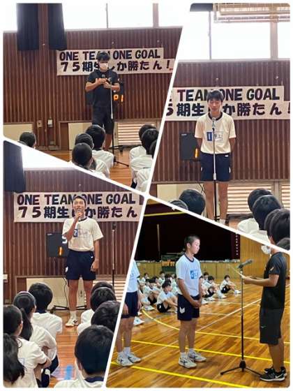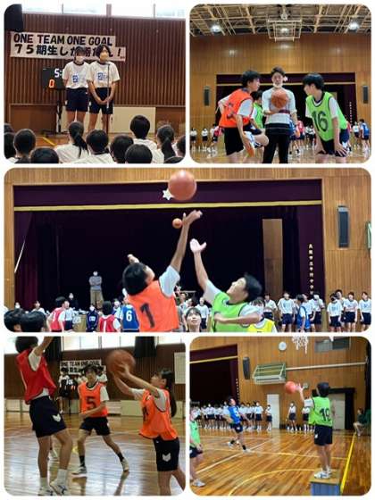 3.4時間目に班対抗でポートボールをしました。各クラスで円陣を組んで士気を高め,試合に臨みました。どの班も試合を重ねるごとに上手にプレーできるようになり、作戦も工夫し、観戦している生徒の応援にも力が入りました。決勝は特に接戦で、声が枯れるくらい応援し、大変盛り上がりました。