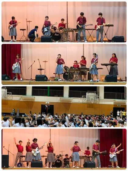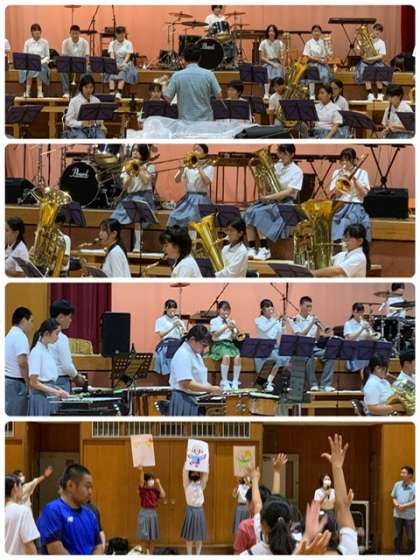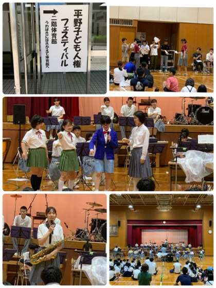 本校と平野北中学校の生徒会・吹奏楽部・軽音楽部の生徒が参加して、校区の小学生にゲームや演奏を披露してくれました。