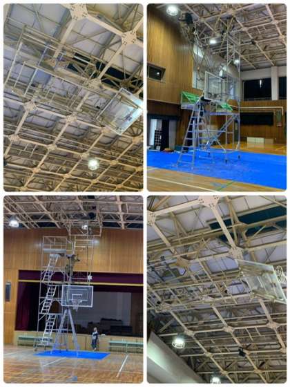 体育館は本日、バスケットゴール修理(ワイヤー、滑車の交換)のため、終日使用できません。