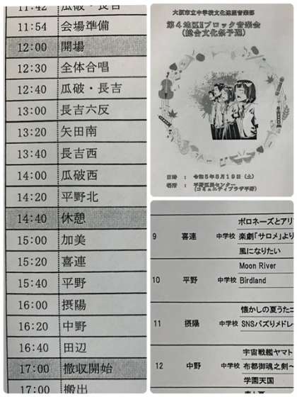 明日、8月19日(土)に大阪市立中学校文化連盟音楽部の第4地区Hブロック音楽会(総合文化祭予選)が開催されます。