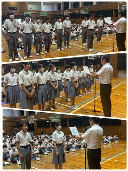 始業式では、校長先生と生活指導担当の先生からお話しがあり、夏休み中の事件や事故等の確認と、2学期に向けて学年ごとにエールが送られました。