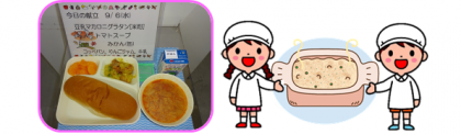 今日の「豆乳マカロニグラタン」は、「食物アレルギー対応サポート月間」※の一環として、乳製品と小麦粉製品を使用せずに調理しています。牛乳やクリームの代わりとしては豆乳を、そして、ルウに使う小麦粉の代わりとして上新粉(米粉)を使用しています。また、オーブンで焼く際に上からふりかけるパン粉も米粉で製造されたものになっています。普段のマカロニグラタンとくらべ見た目にはあまり変わりありませんが、優しい感じの味わいになっています。