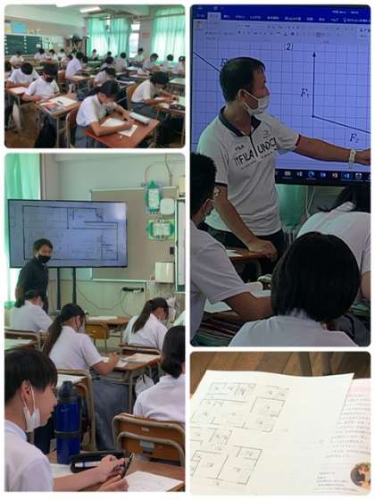 ・3年理科・・小テストの後、力の合成と分解についてプリントの問題を解いています。