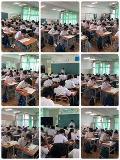 本日中間テストの1日目です。今日は全学年3時間テスト(英・国・社)を実施しました。