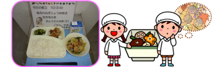 今日の給食では、旬の里いも、れんこん、しめじに、鶏肉とその他の野菜を合わせた煮ものにしています。