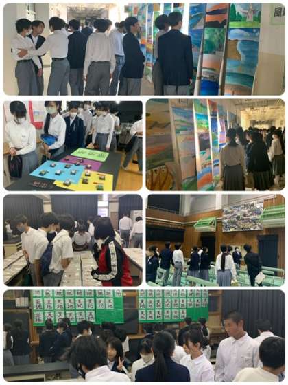 文化発表会 公開日 2023/10/27 更新日 2023/10/27 出来事 生徒の展示見学が始まりました。各教科やクラブ,学年の作品を讃えながら見学しています。 保護者の皆様の受付は9時40分より,間もなく始まります。